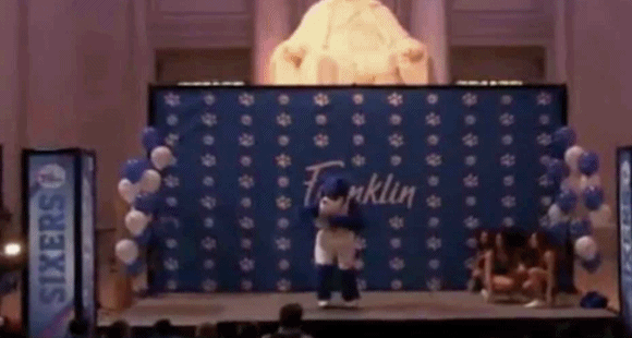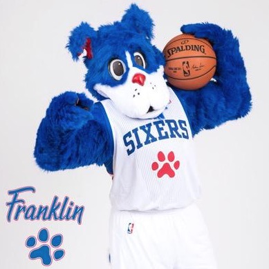 Some number of kids, who should probably be in school, turned out for the unveiling of Franklin, whose backstory is that he’s a dog that was present at famous Philly and Sixers events, such as the signing of the Declaration of Independence…