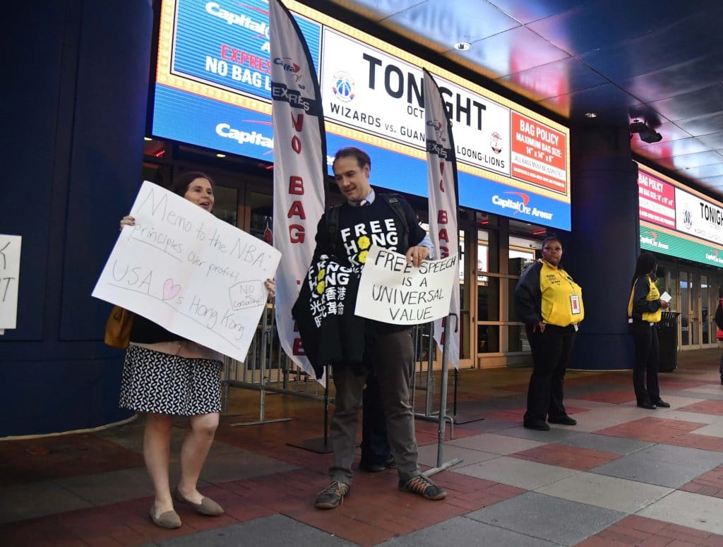 Protesters handed out “Free Hong Kong” T-shirts on the street outside the arena before the exhibition game. The protesters, who said they were from Freedom House, held up signs reading, “Shame the NBA,” ”South Park was right” and “Memo to the NBA: Principles over profit! No censorship! USA loves Hong Kong.”