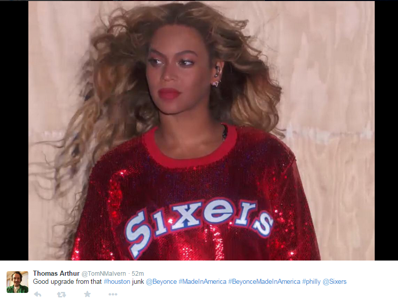 Last night, Beyoncé closed out day one of the annual Made in America festival. She spent a good amount of time wearing a sparkly James Harden onesie, but did play to the crowd a bit by tossing on the also-sparkly Sixers number above for a bit. And at least two crowd members were super into it: Nerlens Noel and Joel Embiid.