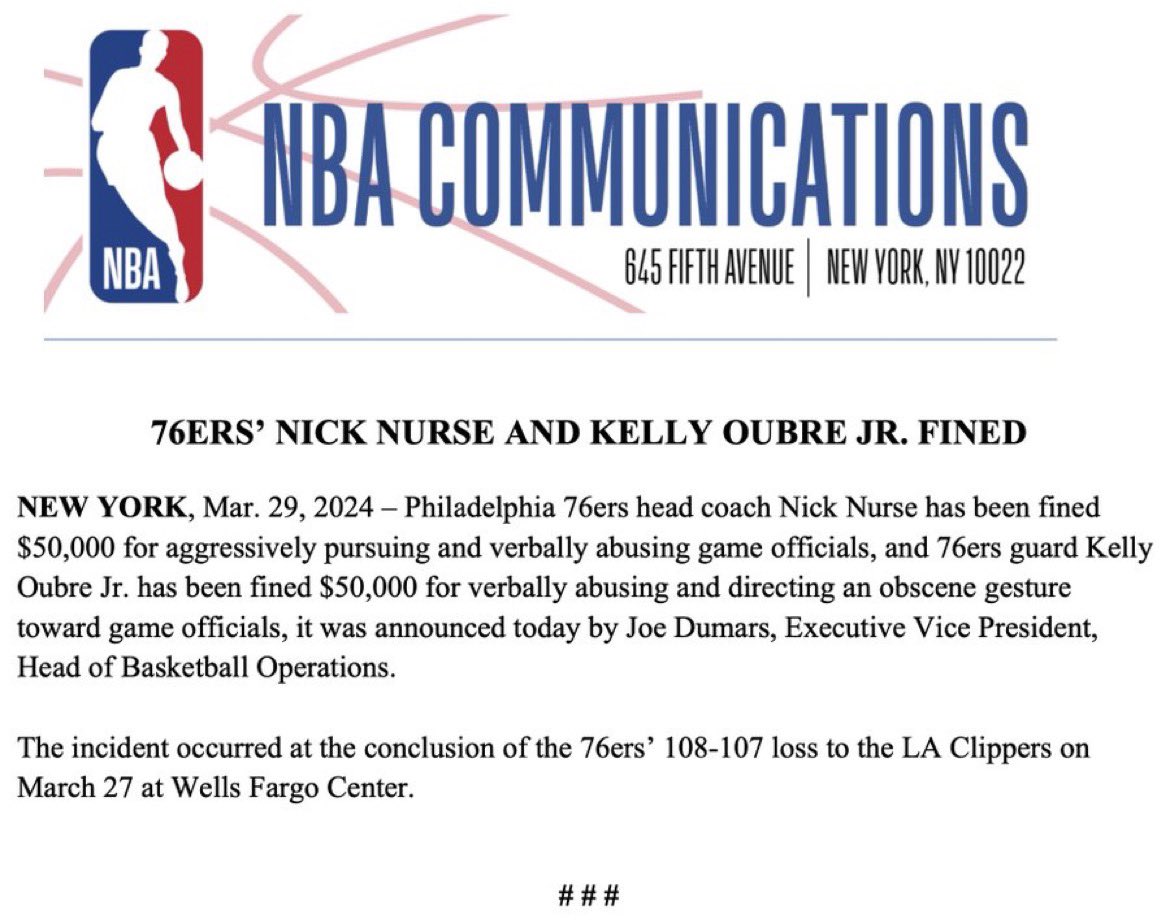 Nick Nurse and Kelly Oubre Jr. Fined $50,000 Each After Going Ballistic on Refs