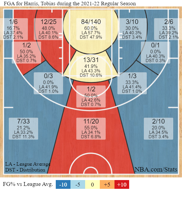 Only four quadrants there where he’s outperforming the league average by a significant margin. He’s hitting a good amount of shots in the paint and around the foul line while lagging behind in eight other quadrants.