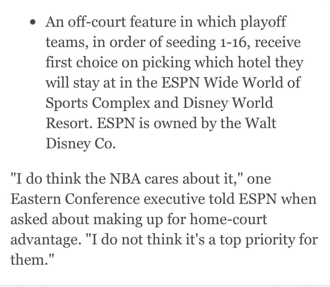 And as far as the hotel and actual hardwood court thing, it’s hard to qualify, but feeling more comfortable certainly helps. Certainly you’d rather stay at a Hilton rather than one of the roach motels on the White Horse Pike, but I can’t imagine Disney hotels would have that much of a disparity, to the point where one team is significantly disadvantaged by staying there.