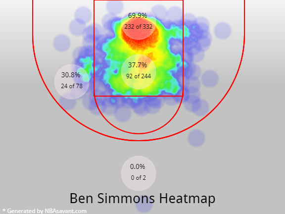 It’s illustrated plainly over at NBASavant.com, where Ben’s shot chart and heatmap show that he doesn’t have a ton of success outside of the paint. But if you’ve watched him throughout the season, you see steady improvement here, where he’s getting at least a little closer to the league average outside of the restricted area but inside the three-point arc: