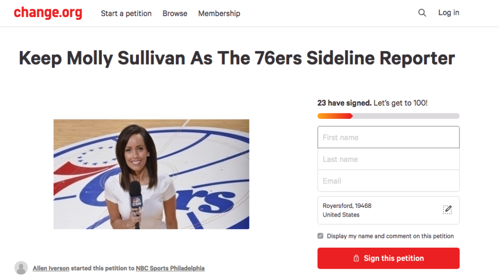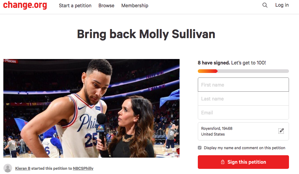 The first petition asks the Sixers to “keep” Molly Sullivan as the sideline reporter: