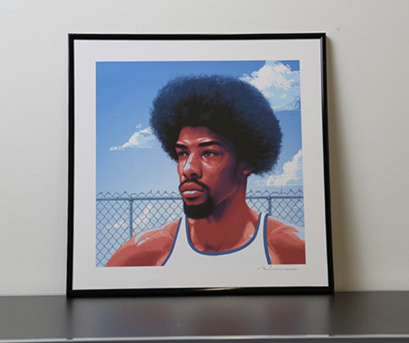 You can practically feel the breeze flowing through Dr. J’s gloriously manicured fro as he stares off into oblivion. What is he thinking about? The duality of man? Kantian ethics and how they apply to today’s modern world? Basketball? It’s probably basketball. Rumor has it if you buy this painting you hear the soft echoes of Parliament Funkadelic’s “Do that Stuff” playing sweetly along the wind in the distance.