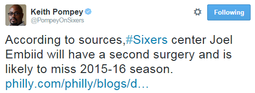 According to Keith Pompey, Joel Embiid is likely to miss the entire 2015-2016 season and will undergo a second surgery on his foot in the near future. According to Pompey’s source: