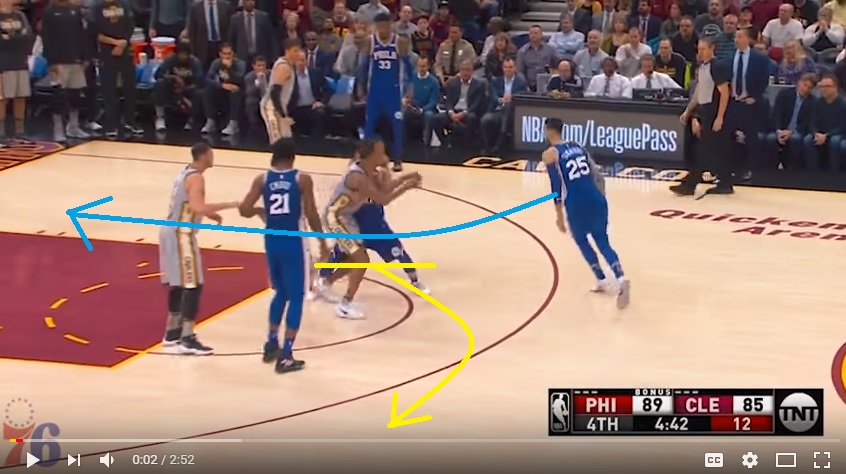 On the second bucket, the Simmons dunk, I think they were trying to set up a Joel Embiid screen to free JJ Redick for a deep look, but Simmons found a seam in traffic and took it himself: