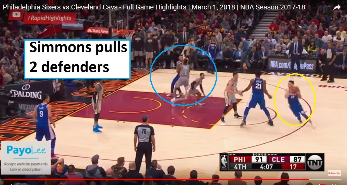 Hood again fights through the screen to switch onto Simmons, which is not reciprocated, leaving Cleveland in a 2v1 against Ben while Redick peels off the Embiid screen for a wide-open three: