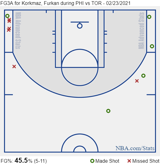 Korkmaz got a start in place of the injured Seth Curry, and holy cow was he due for a game like this. He needed it badly, having hit just one of his last 16 three pointers dating back to the Portland road game.