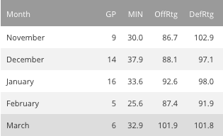 You can of course preface that with an “extremely small sample size” alert, but MCW’s offensive and defensive ratings have improved, and so have basic numbers. That doesn’t include 3PT %, because that number is UGLY.