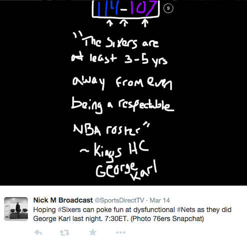 5) Also, if you aren’t keeping up with the Sixers on Snapchat, you should be. Because not only do you get warm up videos and fun memes, but you get some hardcore shade throwing. Earlier this season, before George Karl picked up the mantle and came back into the coaching fray to lead the Sacramento Kings, he said the Sixers would be hard-pressed to win an NBA game, among other things. Then the Sixers beat the Kings. And then the Sixers’ Snapchat sent this out: