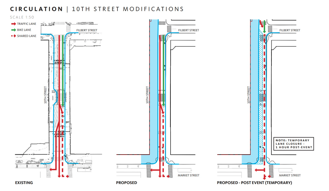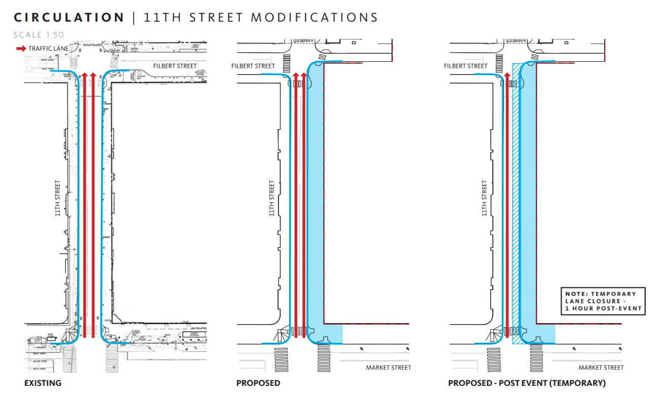 Postgame, 10th and 11th street will move from two lanes down to one and the sidewalks will be expanded for pedestrians for an hour after an event:
