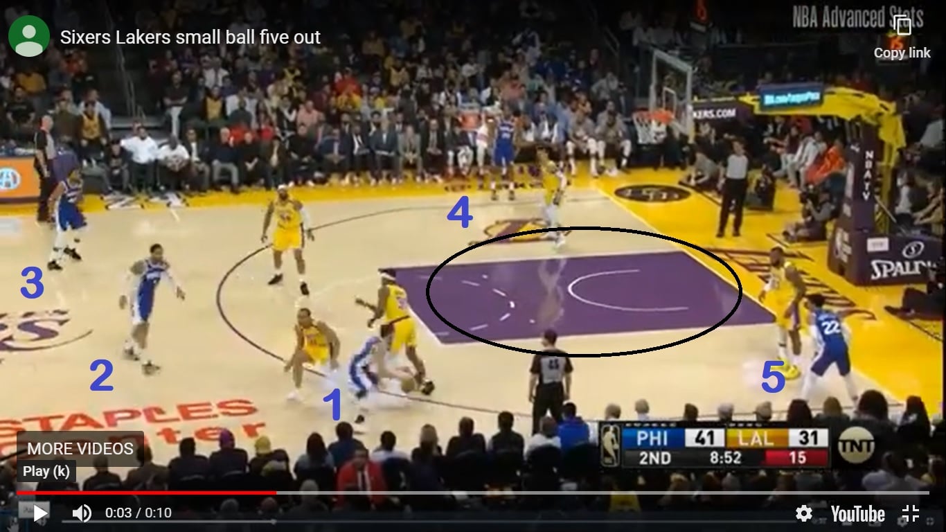 The second clip is just LeBron being LeBron, a short little dribble into the zone, then he pulls up and sells the corner outlet pass, which gets Tobias Harris to move off his spot. That leaves a seam for Howard to backdoor his way to the rim along the baseline: