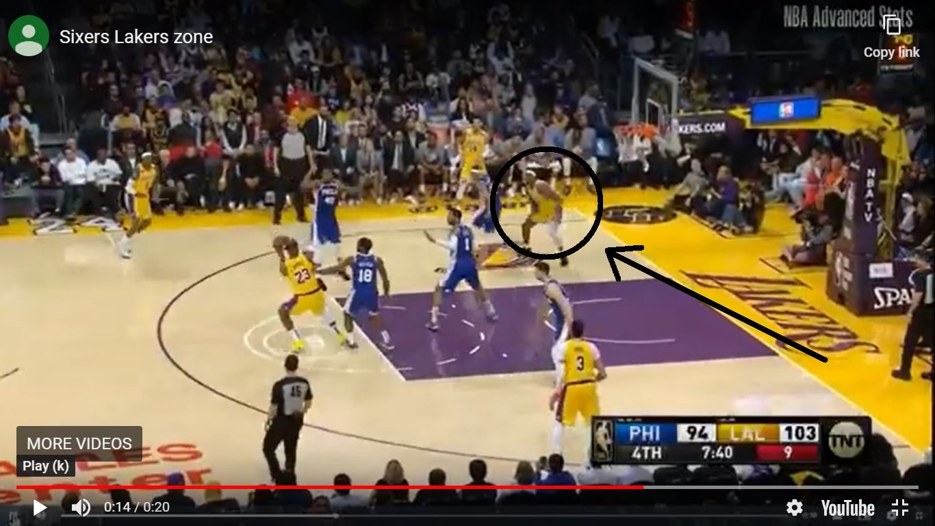 That first clip looks like 1-3-1 zone, but it could be a blown 2-3. This took place after a timeout with Furkan Korkmaz and Shake Milton showing a bit of three-quarter court pressure. Not sure if this was the plan, or if they scrambled to find their spots, but GRIII ends up trying to front Howard while Scott addresses Davis at the nail. LeBron sees what’s going on and takes the return pass from the wing before just lobbing over the top for the dunk.