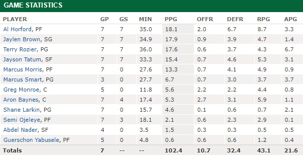 Something’s gotta give in this department. It’s sort of like the unstoppable force against the immovable object, a question for the philosophers (such as Nietzsche, Socrates, and Jeff Van Gundy). You’re going to see some battles on the glass, and we’ll find out if Dario Saric and Ersan Ilyasova can continue to wriggle into those tight spots to grab missed shots and create extra possessions. Al Horford leads the Celtics with 8.7 RPG in the playoffs and Jayson Tatum, the rookie wing scorer, chips in a second-best 5.3. Aron Baynes will come off the bench to be a pain in the ass on both ends and he leads their offensive rebounding effort with 2.7 per game.