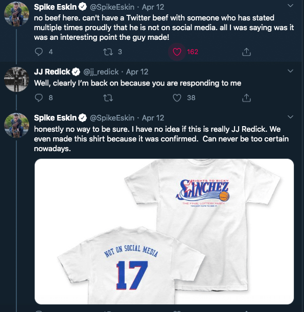 Redick chose to drive the final nail into the coffin with one last tweet to Eskin. For a guy who claimed he was through with social media last year, JJ’s certainly active on twitter when he wants to drive Eskin crazy.
