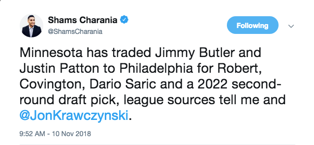 Minnesota has traded Jimmy Butler and Justin Patton to Philadelphia for Robert, Covington, Dario Saric and a 2022 second-round draft pick, league sources tell me and @JonKrawczynski.