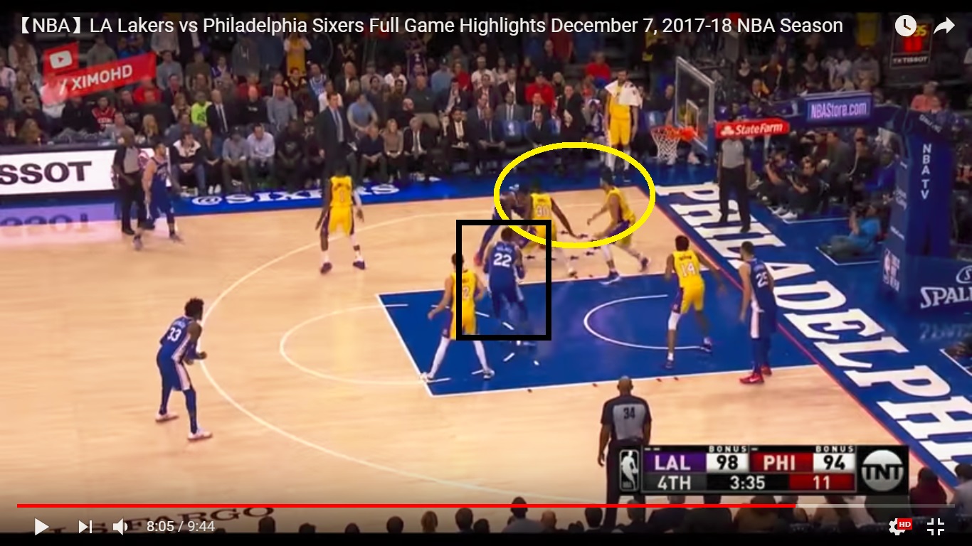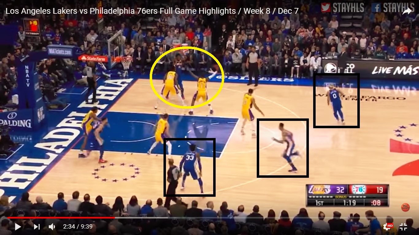 Nice recognition from Joel there to kick it out to Robert Covington after Kentavious Caldwell-Pope collapses on him and then blows a defensive assignment.