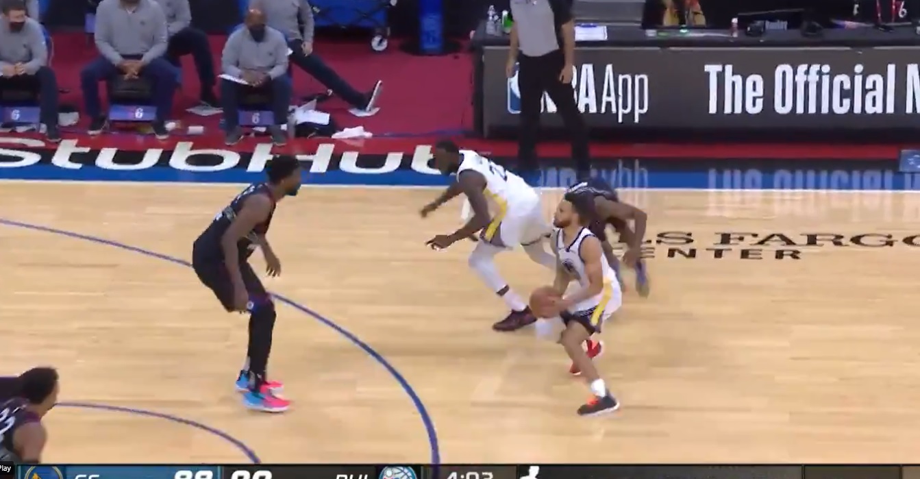 You tip your cap to the guy but wonder if it’s worth trapping or blitzing here and living with the results. Curry is great in space, and Draymond is a good roller and elite passer. Maybe it gives them a run to the rim or a wide open three for somebody else, but at least Curry isn’t taking it, and the Sixers just weren’t able to do much or didn’t try to do much to get the ball out of his hands. I think fans are justified in applauding the individual performance while also feeling somewhat frustrated that the Sixers didn’t make any kind of adjustment in guarding him. Again, with Simmons and Harris on the floor, it’s likely much different.