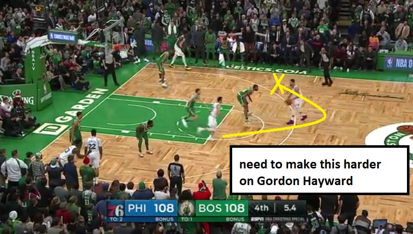 The only problem I have with using Ben in that situation is that he’s obviously not a threat to shoot, so if you cut off the lane, you know he’s going to dump it off to Redick instead. And in this situation, he really didn’t get any contact on Gordon Hayward, nor did JJ do a good enough job of running Hayward into Marcus Morris. It was rushed and poorly executed: