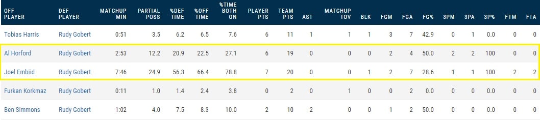 Here’s how the matchups played out via tracking data. Horford shot 50% on four shots when guarded by Gobert, while Embiid was 2-7. You can click on this image to enlarge: