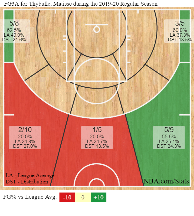What’s especially nice is that he’s hitting from the corners, which is where the Sixers could really use somebody to help space the floor in a half court offense that features some overlapping and redundant skills sets (Embiid/Simmons/Horford). Matisse is shooting better from the corners than above the break this year in a small sample size of shots: