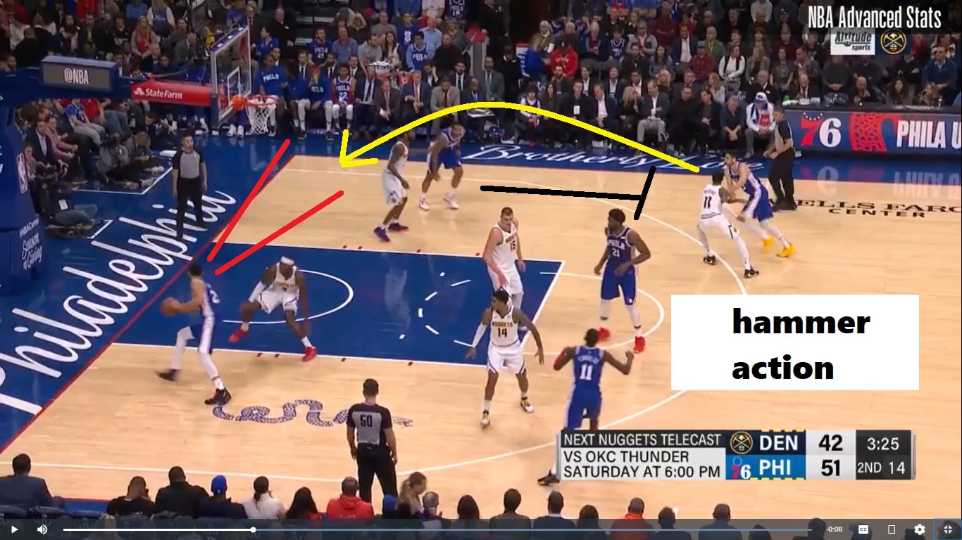 But there was a stretch in the second quarter when the Sixers were struggling with turnovers, so he dialed up what’s known as “hammer action,” which is a San Antonio concept that frees up a weak side player for a corner three point look. They executed it very poorly, but watch anyway: