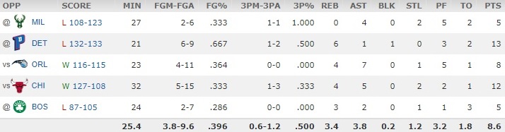 He also is not getting to the foul line. He hasn’t even taken a free throw since the Chicago game and he’s attempted only four FTs this entire season.