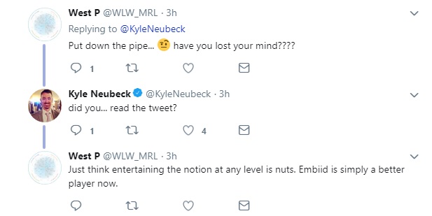 Kyle Neubeck at Philly Voice did a mailbag post today, and he led off with a hypothetical question about trading Joel Embiid for Anthony Davis. He shared the post on Twitter with this description:
