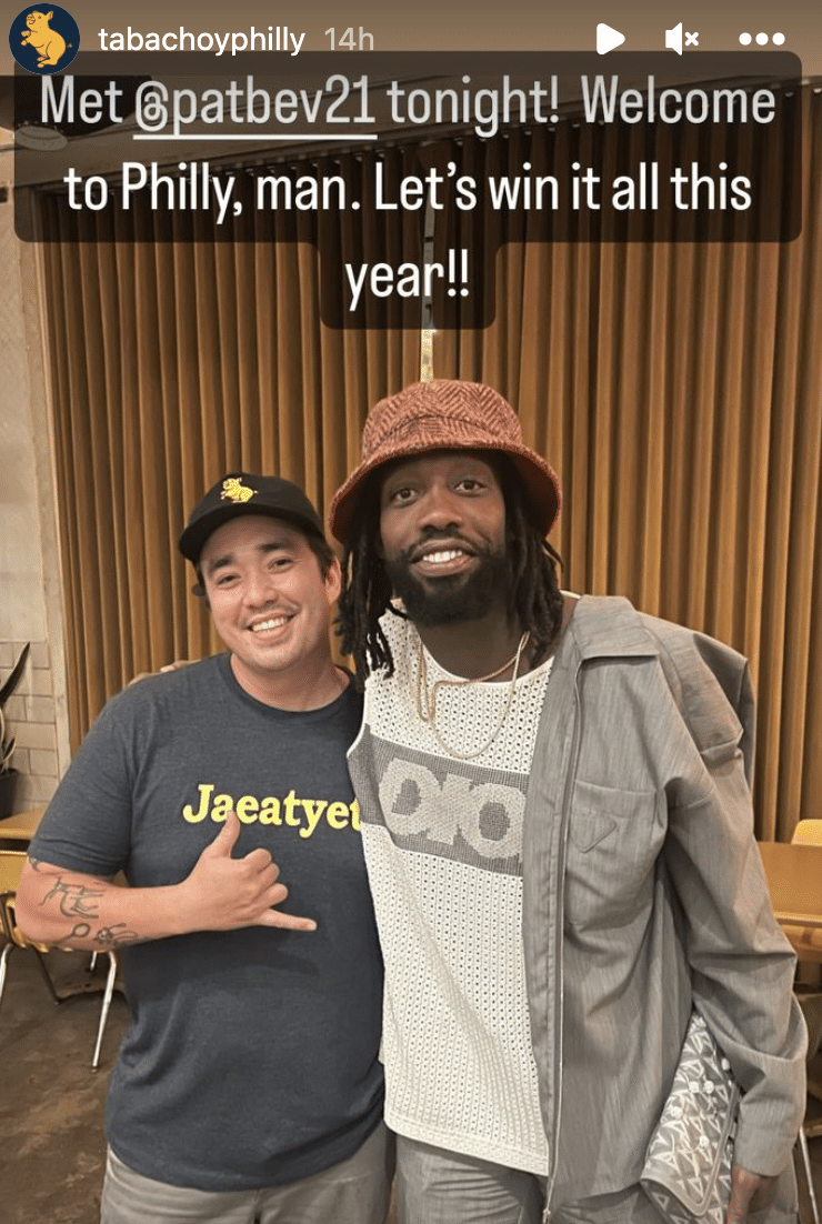 Pat Bev is becoming one with the city. You gotta love it. Just wait until he’s breaking ankles at Seger Park. Maybe he’ll take in a DMB show on the Susquehanna Bank Center lawn. What cheesesteak is he going to get first? That’ll be the real test to see if he’s cut out for this city or not. So far so good, but it could all go up in smoke if he’s spotted at Pat’s or Geno’s.