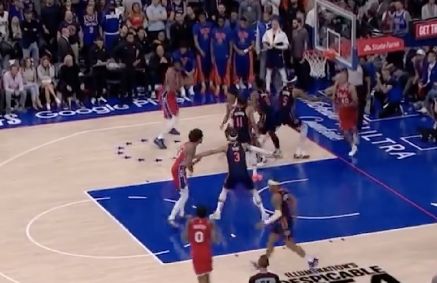 Lowry hits the first and intentionally misses the second. What are the Sixers guards doing? Why is Maxey by the half court not even in the frame and why is Oubre hanging out with John Starks on the sideline? This set up makes zero sense: