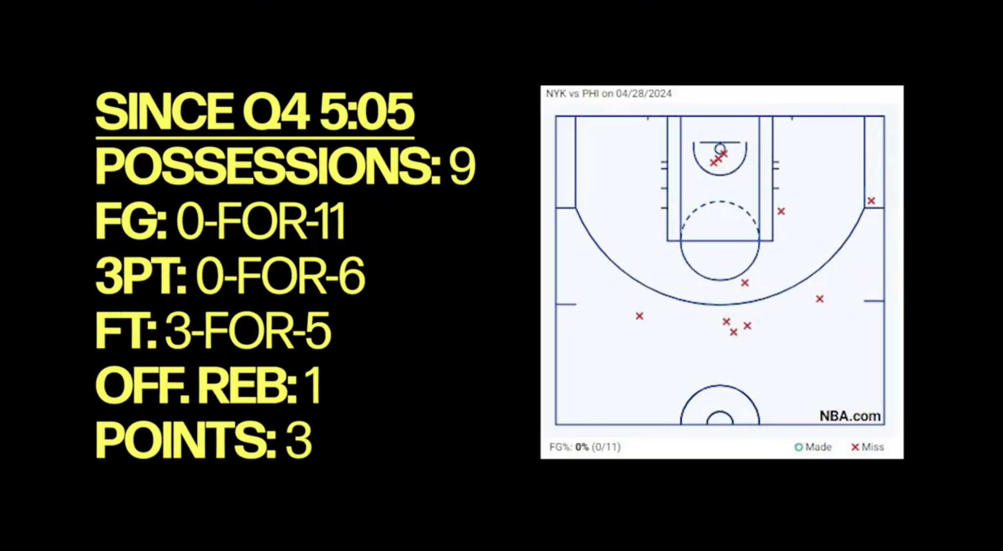 Nine possessions, three points, 0 for 11, 0 for 6 from three, and two offensive rebounds. Despicable. Joel Embiid wants us to keep showing up for that performance time after time again? We just watched the same horror movie last year.