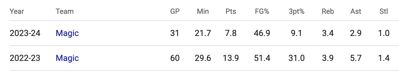 Markelle posted career highs across the board last season, when he was 24 years old. He averaged 14 points, 4 rebounds, and 6 assists, shooting 51.4% from the field. He only turned the ball over 2.3 times per game, playing 29.6 minutes on average and starting all 60 of the contests he appeared in. His three point number was 31%, but he was only trying 1.5 per game, so that’s negligible. He plays an Allen Iverson-ish combo guard type of game for the Magic, working from inside the arc and/or getting to the rim.