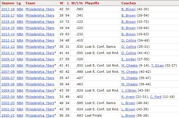 If you started your Sixers fandom after the Larry Brown years or you’re somewhere in your early twenties, that chart above is probably the only thing you know.