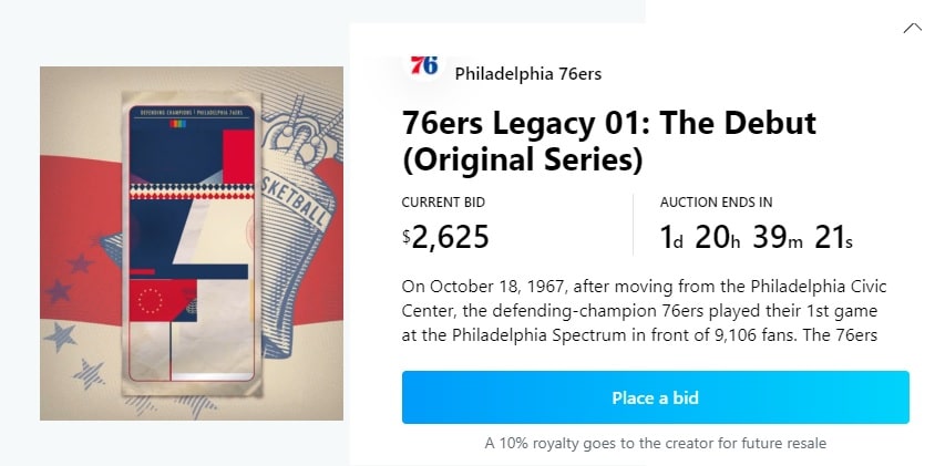 In this case, the first Sixers “Original Series” NFT is currently holding a bid of more than $2,500. It’s an animated ticket representing the first game at the Spectrum: