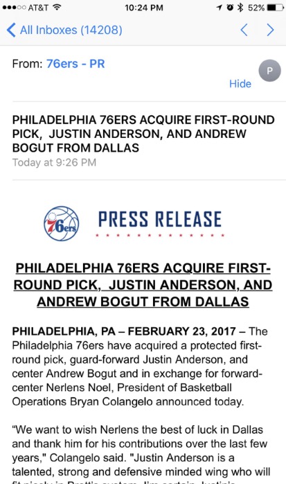 OFFICIAL: Sixers Acquire First-Round Pick, @JusAnderson1, And @andrewbogut From Dallashttps://t.co/9kWrBMKRQa