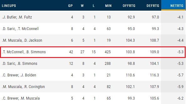 Elsewhere on the stats page, you find that opponents are shooting 50.6% against lineups featuring McConnell and Simmons, which is the third-worst number among two-man lineups that have played at least 100 minutes.