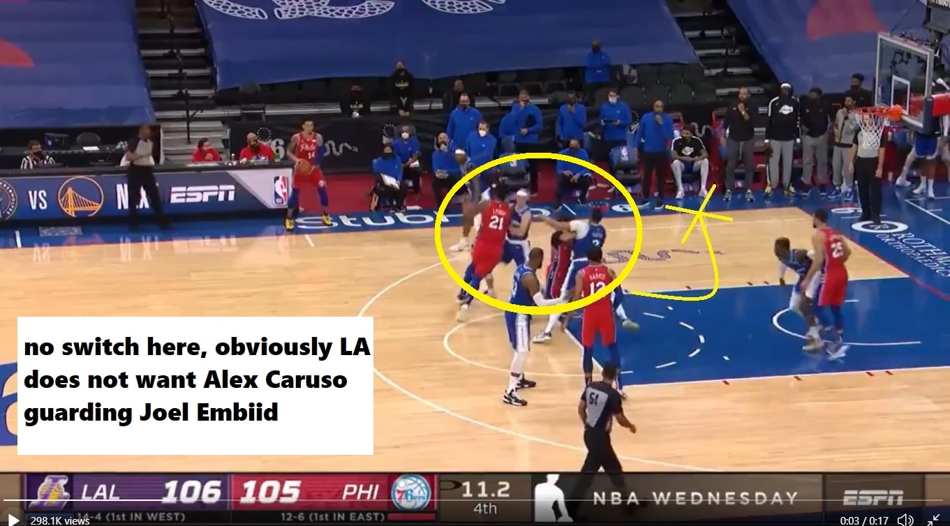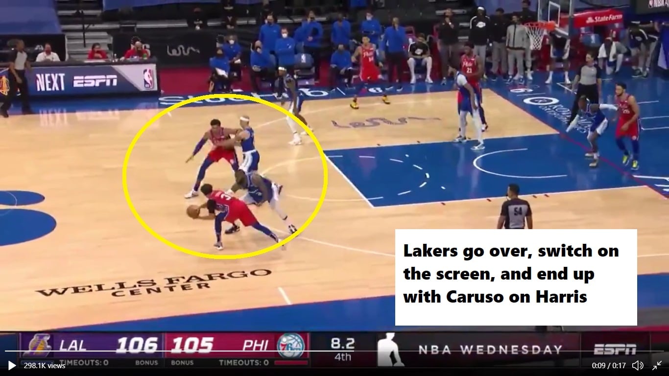 What happens is that Harris sets the screen, Caruso goes over, and then LeBron James steps up to close down Curry. That results in Caruso circling back and switching onto Harris, which gives the Sixers the mismatch at the nail with 8.2 seconds on the clock: