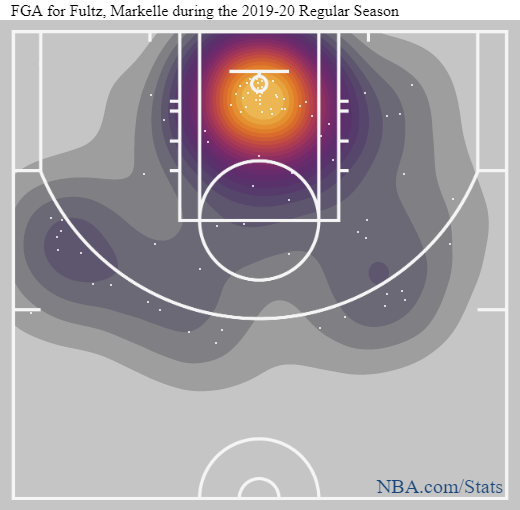 Not dissimilar from what he did during his time in Philadelphia, but his two-point and free throw percentages are up significantly. Most of his success is coming right around the rim, as you can see in this heat map right here: