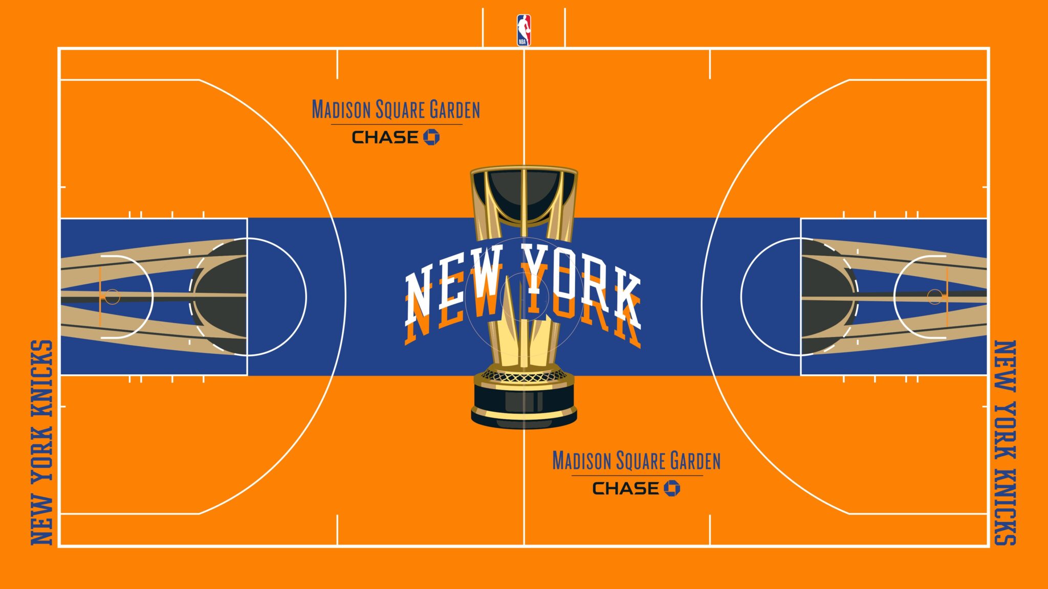 All of the courts follow the same general motif. Trophy outline with colors that pop. Here’s the Knicks’ floor: