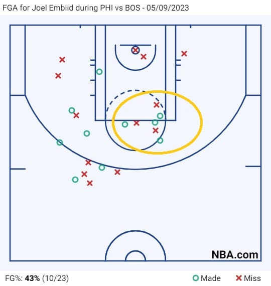 In the case of the first clip, Robert Williams meets James Harden at the elbow, but Embiid is able to short roll to the nail and get into his mid-range comfort zone. Harden can throw that return pass from his stronger left hand, and it resulted in a bunch of great looks for Embiid right around the stripe, which you see on the shot plot: