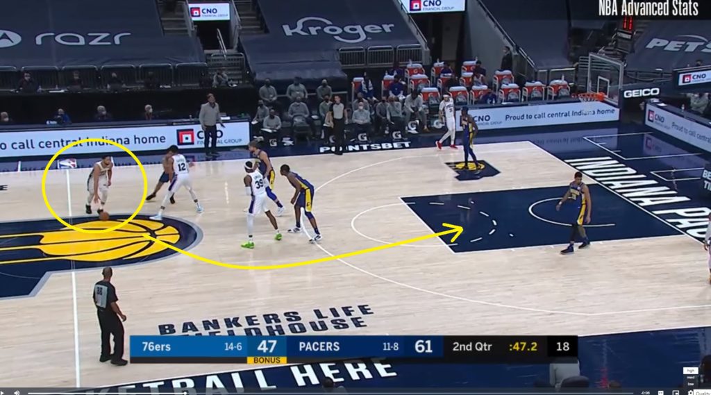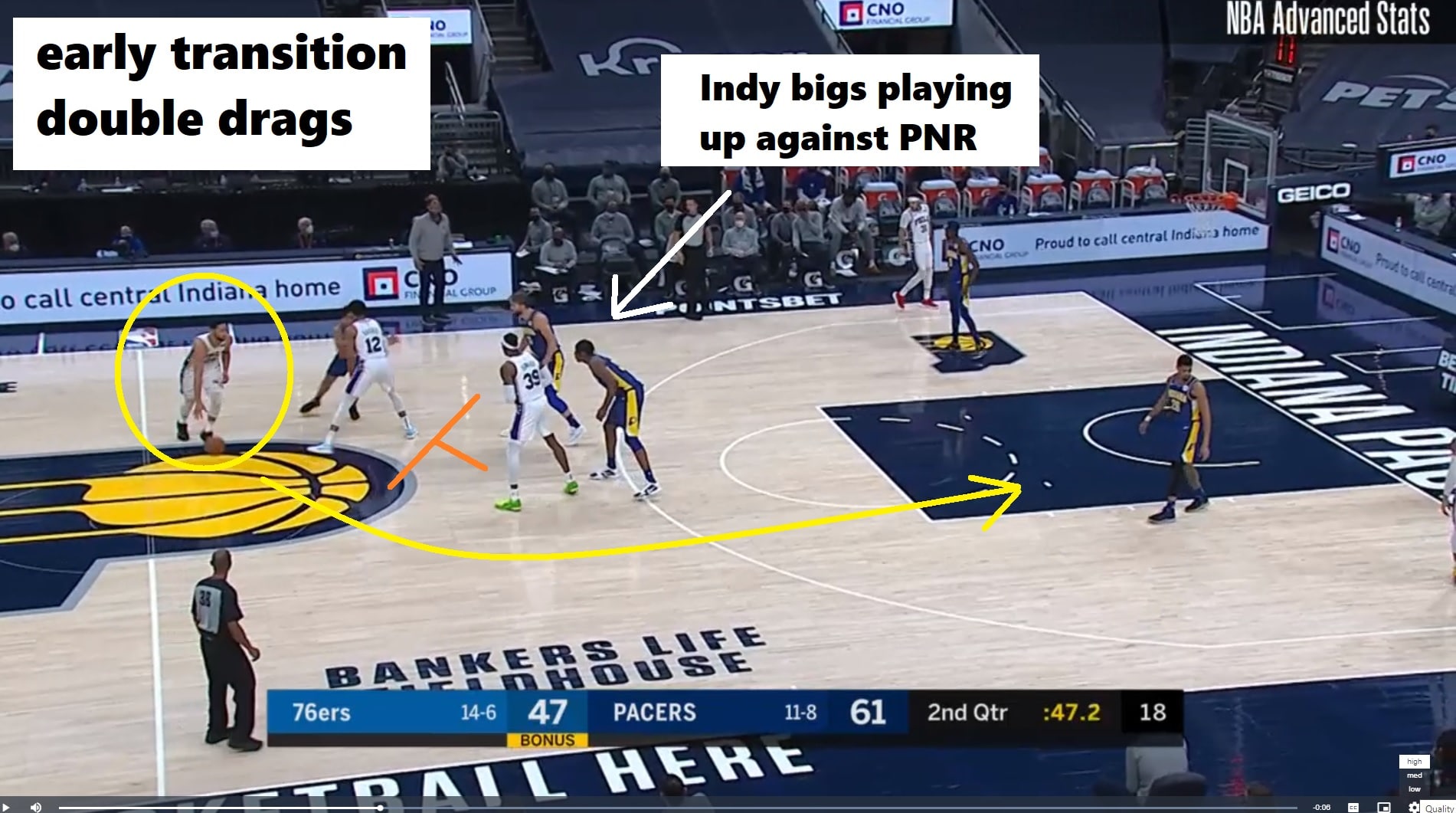 As Doc mentioned, Indy likes to play up on pick and rolls, so when the angled screens are set in early transition, Myles Turner and Domantas Sabonis will find themselves so far out that sometimes they’re standing on the three-point line: