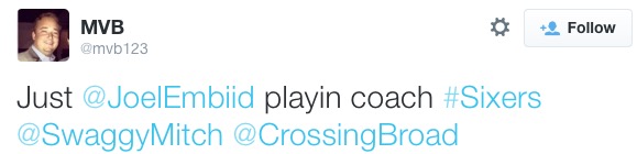 In a battle to see who can score fewer points this evening, the Sixers reached deep into their bag of tanking tricks and let Nerlens Noel – of course not playing because, ah, you know, some ankle thing or whatever they put on the injury report – draw up a play. I texted Jim about his Tweet, and unfortunately for the Sixers, the play… worked: