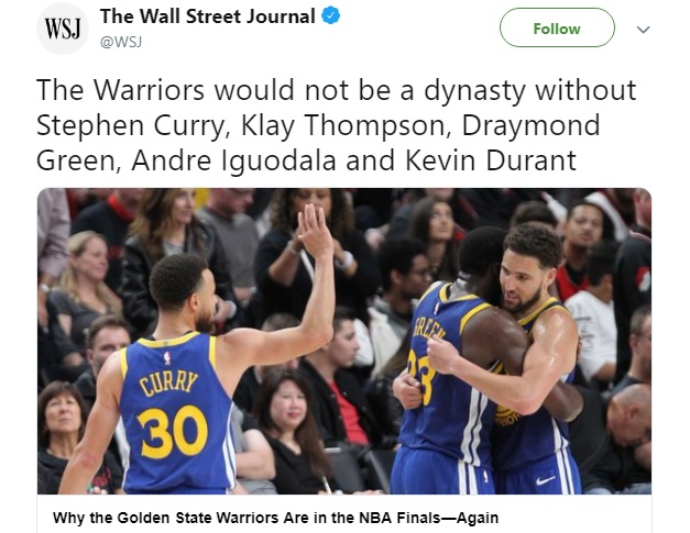 The Warriors would not be a dynasty without their 10-time All Star (Durant), their 3-time All Star (Green), their 5-time All Star (Thompson), their Future Hall of Famer (Curry) and their defensive specialist and elite glue guy (Iguodala).
