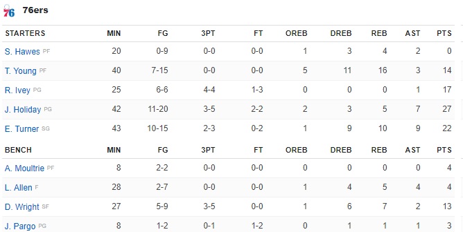 Brett Brown called for the Steph Curry double team and Barnes found himself wide open in the corner for the dagger. Philly only turned it over 10 times that night but suffered through a 4-16 three-point shooting night from the starting five. They really had a chance to win this one.