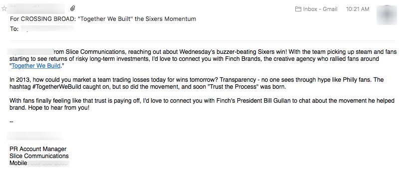 [Redacted] from Slice Communications, reaching out about Wednesday’s buzzer-beating Sixers win! With the team picking up steam and fans starting to see returns of risky long-term investments, I’d love to connect you with Finch Brands, the creative agency who rallied fans around “Together We Build.”