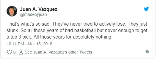 To put a bow around what my pal @FisolaNYDN just tweeted, the Knicks are on the verge of losing 49 or more games for the 10th time in 14 seasons. To go with having lost more games than anybody in the league over the past 17. Trust the process. Oh, wait. There is no process.