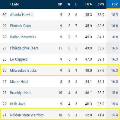 Warriors and Bucks, a combined 17-2, with 15.4 and 16.3 turnovers per game this season. The kicker is that they shoot 52% and 48%, respectively, so the giveaway numbers are wiped out.