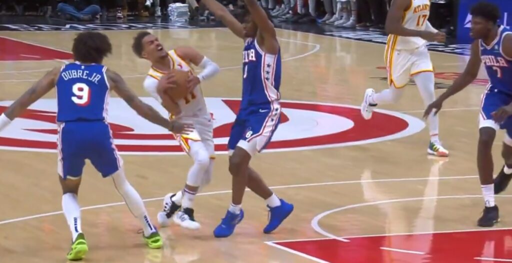 The Joel Embiid-less Sixers lost to the Hawks in overtime on Wednesday night and Tyrese Maxey fouled out on this sequence: