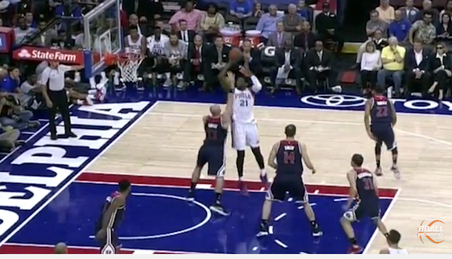 One thing that stands out in the video, around the 3:30 mark, is Embiid losing his cool a bit when he didn’t get the ball in a mismatch. Gerald Henderson somehow didn’t see the 7’2″ behemoth towering over a Morris twin, and Embiid let him know “Hey, I’m open,” but in his own way:
